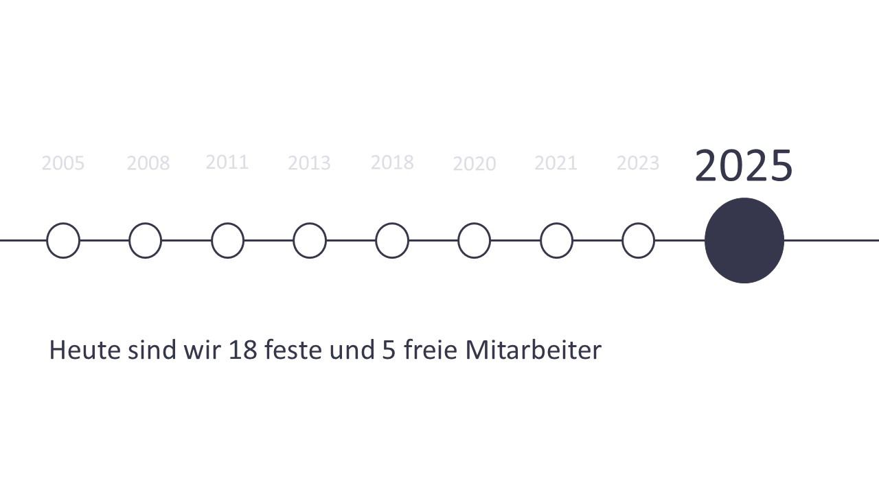 Heute vereinen wir das Know-how von 18 festen und 5 freien Mitarbeitern – und setzen gemeinsam Projekte effizient, zuverlässig und mit Leidenschaft um.